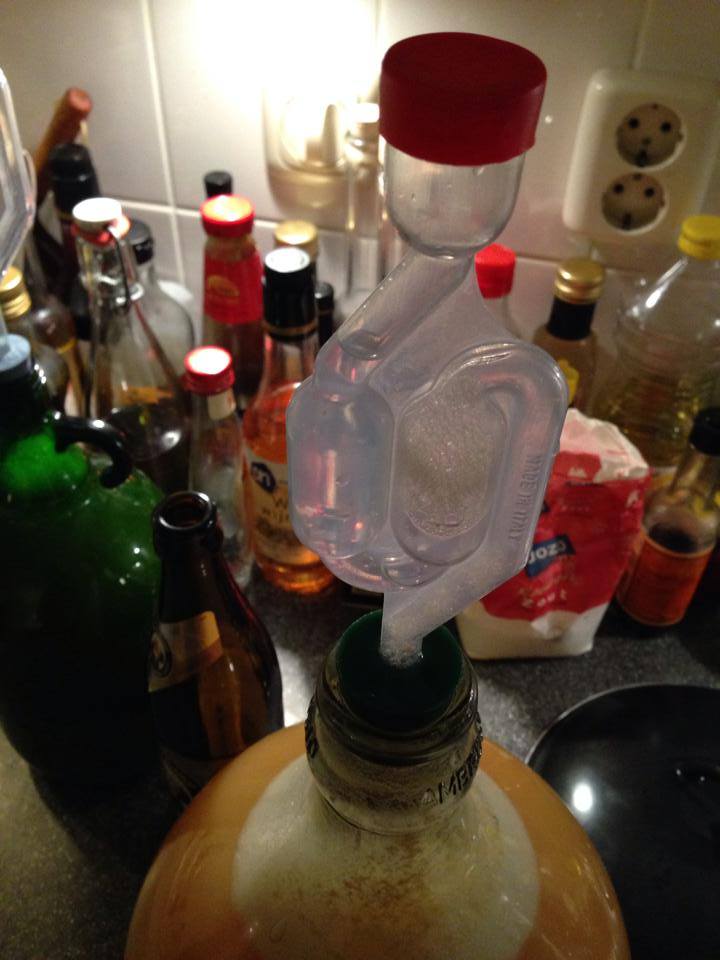 Omdat ciders met deze sappen goed bevielen staat er nu 2 liter peer en bijna 5 liter appel te fermenteren. Bij de appelvariant schuimt het waterslot zelfs vol. Dit kan je voorkomen door het vat minder vol te doen. Over iets meer dan een maand weten we hoe het smaakt.