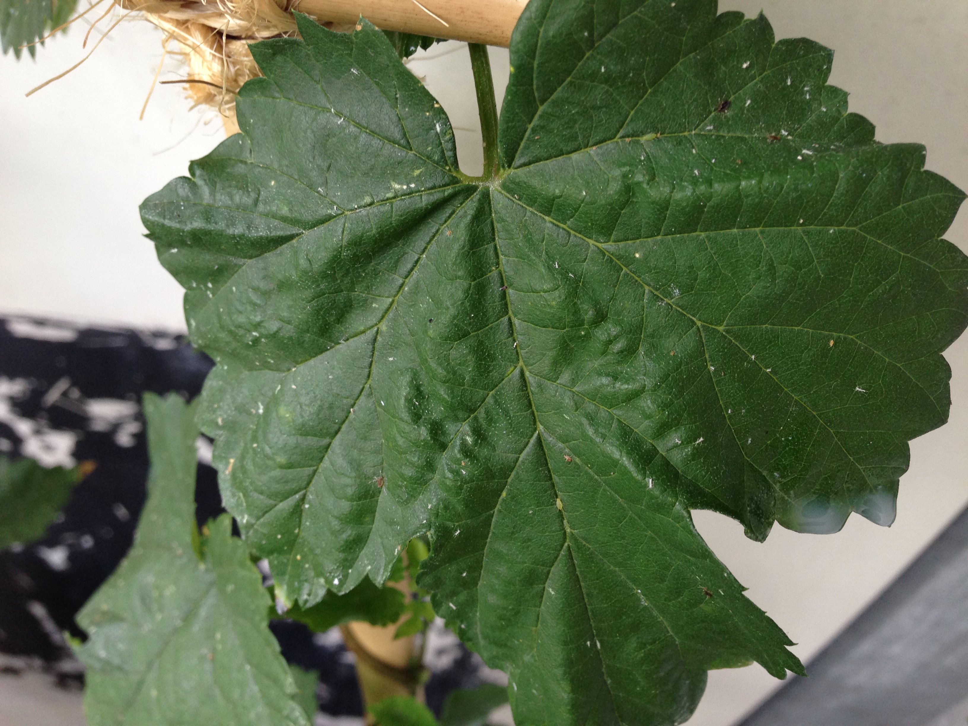[stag_intro]Het is misschien niet heel duidelijk te zien maar toch zit er een laag witte schimmel op het blad. Vooral de onderste bladeren van de hop, tot ongeveer 1,5 meter hoog, hebben er last van.[/stag_intro]