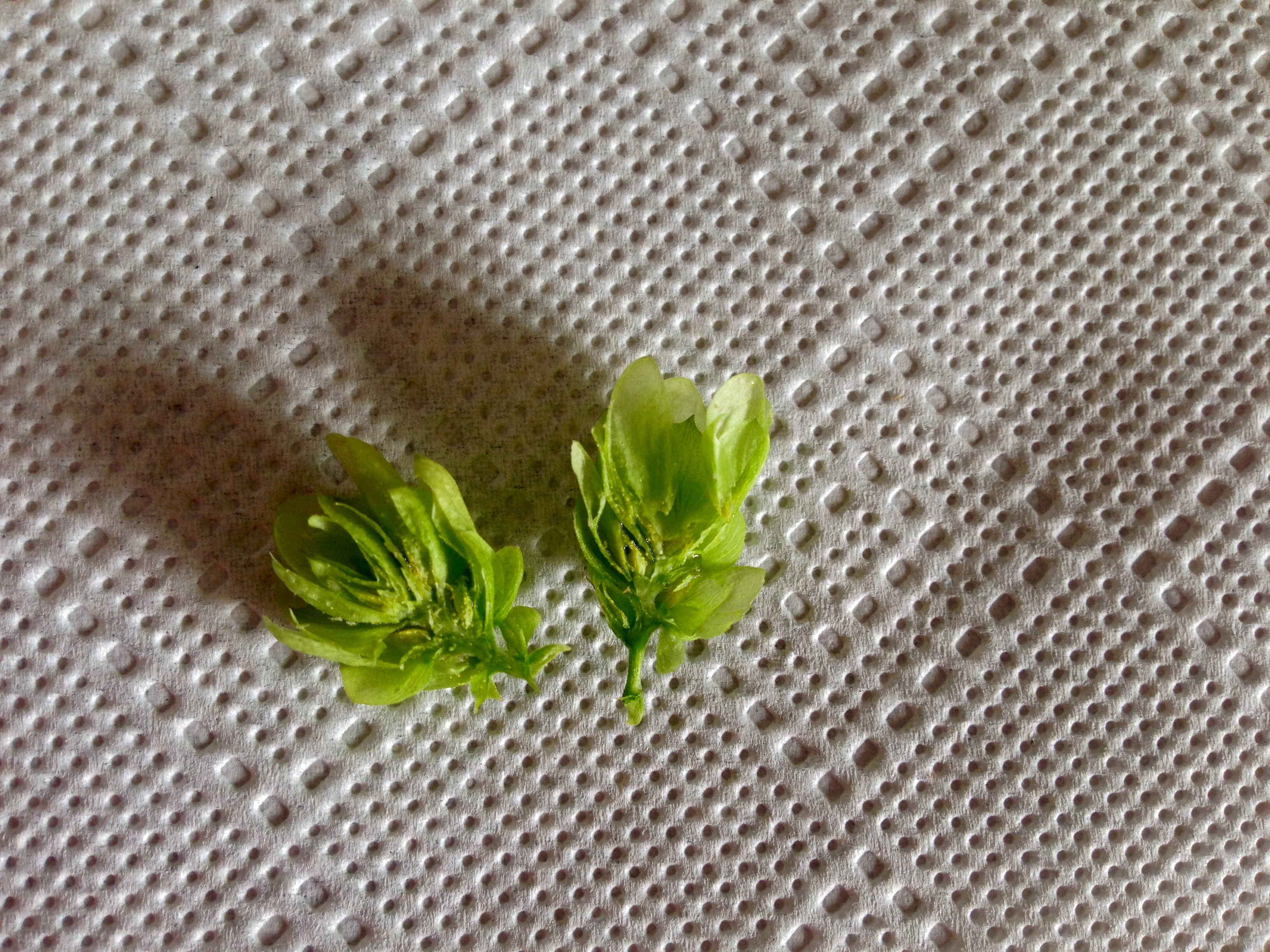 Het moeilijkste van hop oogsten is bepalen wanneer de hop klaar is. Als je een bloem tussen je vingertoppen pakt, hem op en neer draait en hij papier-achtig kraakt dan zit je op zich goed, zo leerde het internet. Je kan ook een bloem opensnijden en kijken hoe geel de lupuline, de kleine gele korreltjes, zijn. Lupuline geeft bier zijn bittere smaak en maakt het langer houdbaar.