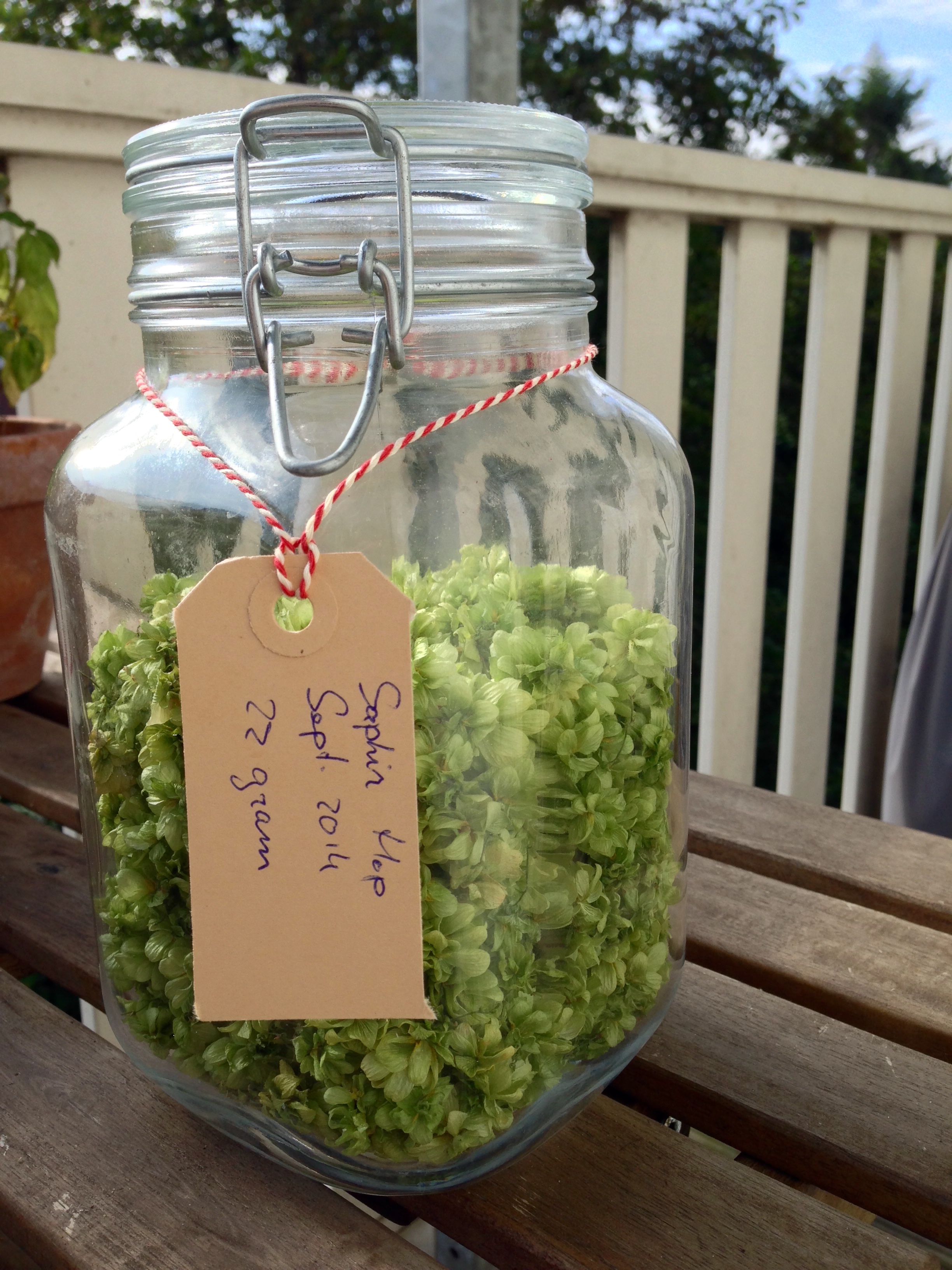 Dat is alleen niet zo omdat ik in mijn eerste brouwsel enkel natte hop heb gebruikt. In de pot op de kast zit nu nog 22 gram gedroogde hop voor later die ik waarschijnlijk ga gebruiken voor het koudhoppen (of dry hoppen) van bier.