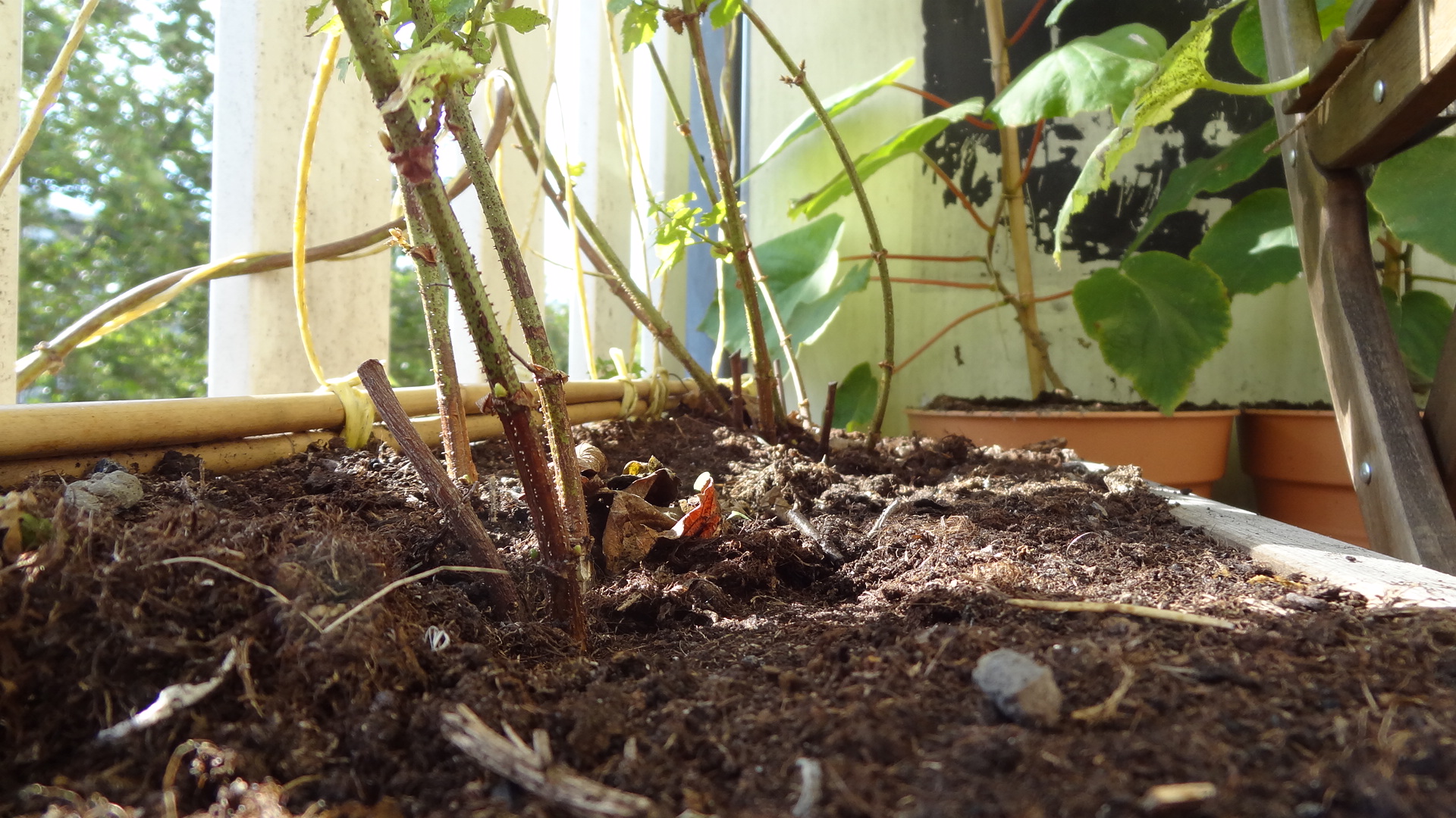 Dat is helaas ook nog eens mijn eigen schuld. De bak waarin de hop staat is best wel klein en bestaat op dit moment bijna helemaal uit een wortelkluit. Daarnaast kwamen er in de lente heel veel scheuten op waarvan ik er tien liet staan. Dat waren er gewoon veel teveel.