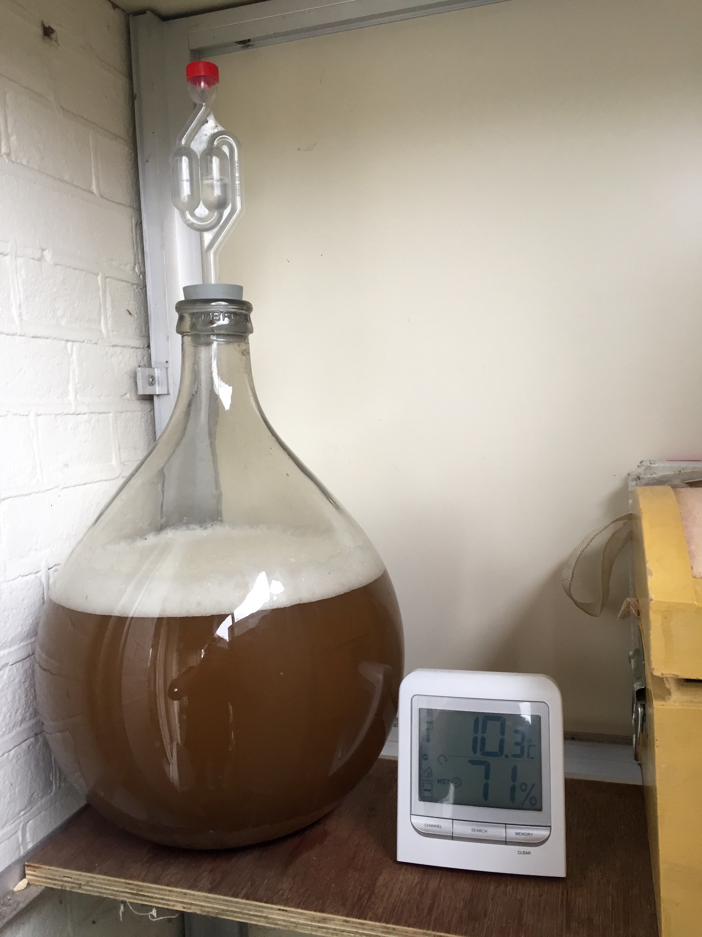 8 februari: Gisting grotendeels voorbij. Koudhop toegevoegd. Ruikt nog steeds zwavelig.